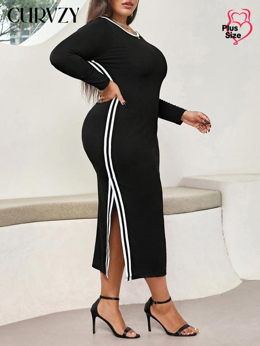 CURVZY plus Size Contrast Binding Split Hem Bodycon Dress, Casual Long Sleeve round Neck Ribbed Dress for Fall, Women'S Clothing for Daily Wear